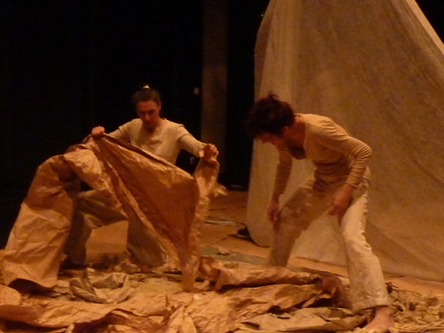 Olivia et Emmanuelle reprennent la scène d’introduction avec de grandes feuilles de papier kraft. Cela présente l’avantage de mouvements plus amples et d’une installation sur scène plus vaste, mais le bruit des feuilles couvre ma voix et modeler les héros en kraft relève du défi !